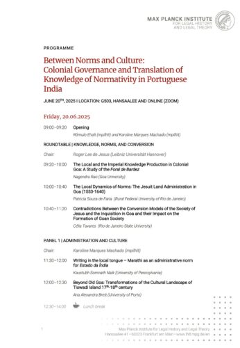 Workshop Between Norms and Culture: Colonial Governance and Translation of Knowledge of Normativity in Portuguese India, Max Planck Institute for Legal History and Legal Theory, Frankfurt, Germany